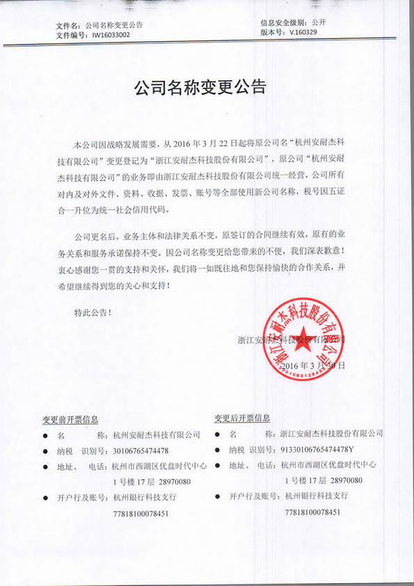 本公司因戰(zhàn)略發(fā)展需要,從2016年3月22日起將原公司名“杭州安耐杰科技有限公司”變更登記為“浙江安耐杰科技股份有限公司”,原公司“杭州安耐杰科技有限公司”的業(yè)務即由浙江安耐杰科技股份有限公司統(tǒng)一經營,公司所有對內及對外文件、資料、收據、發(fā)票、賬號等全部使用新公司名稱,稅號因五證合一升位為統(tǒng)一社會信用代碼。